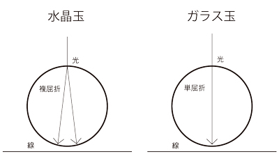 これは、水晶が持つ複屈折性を利用した鑑定方法。光が水晶を通過する際、複数方向に光が拡散するので、水晶玉の下にある1本の線が2本に見えるのです。対してガラスは単屈折性なので、線は1本にしか見えません。自分が持っているものが水晶かどうか判別する時はいろんな角度から見てみましょう。それでも1本しか線が見えなければ、それは残念ながら水晶ではありません。